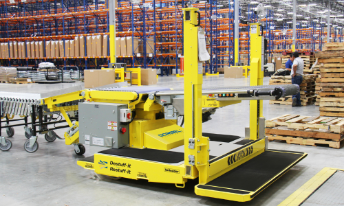 Portable Ergonomic Conveyor Systems, the Destuff-it™ and Restuff-it™, are designed to help workers load and unload containers and trailers faster. The Destuff-it and Restuff-it help your dock personnel safely and quickly move packages up to 165 lbs. Operators experience more throughput and greater handling capacity with less fatigue and muscle strain because of optimal positioning to the box wall. Whether handling a single SKU or dozens, the Destuff-it or Restuff-it machine helps your people get boxes to or from the dock area for sorting and palletizing in a safe, efficient manner.